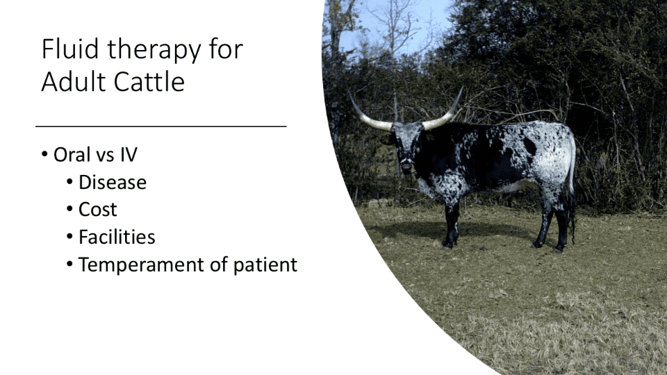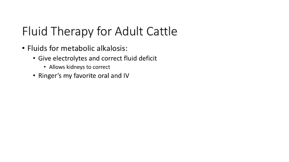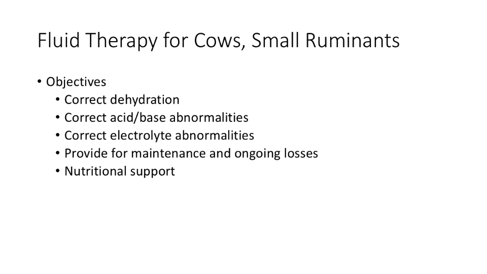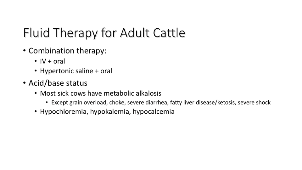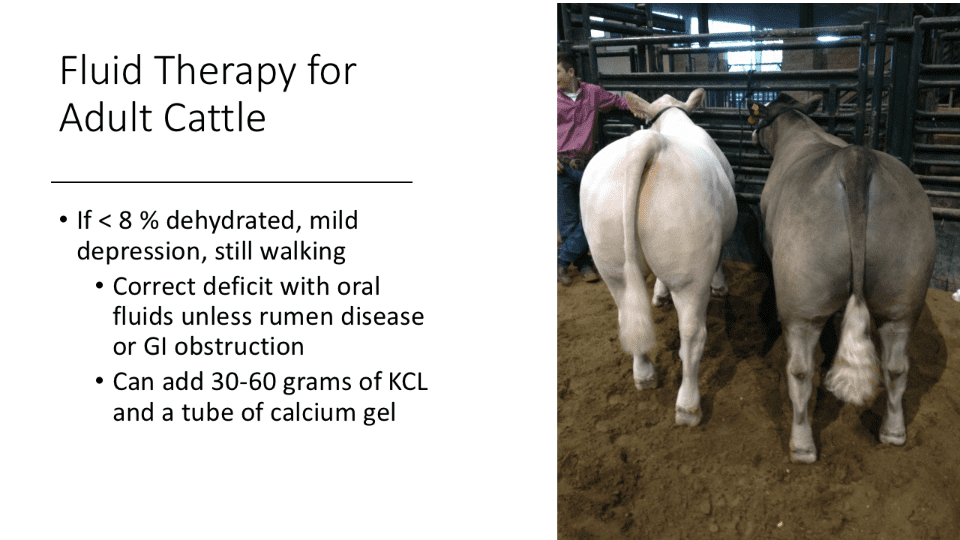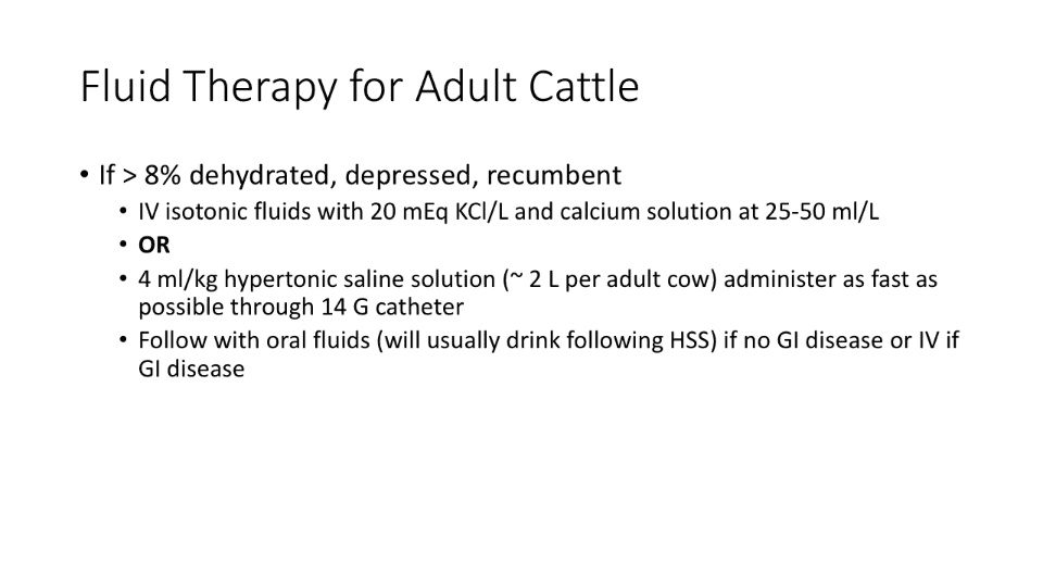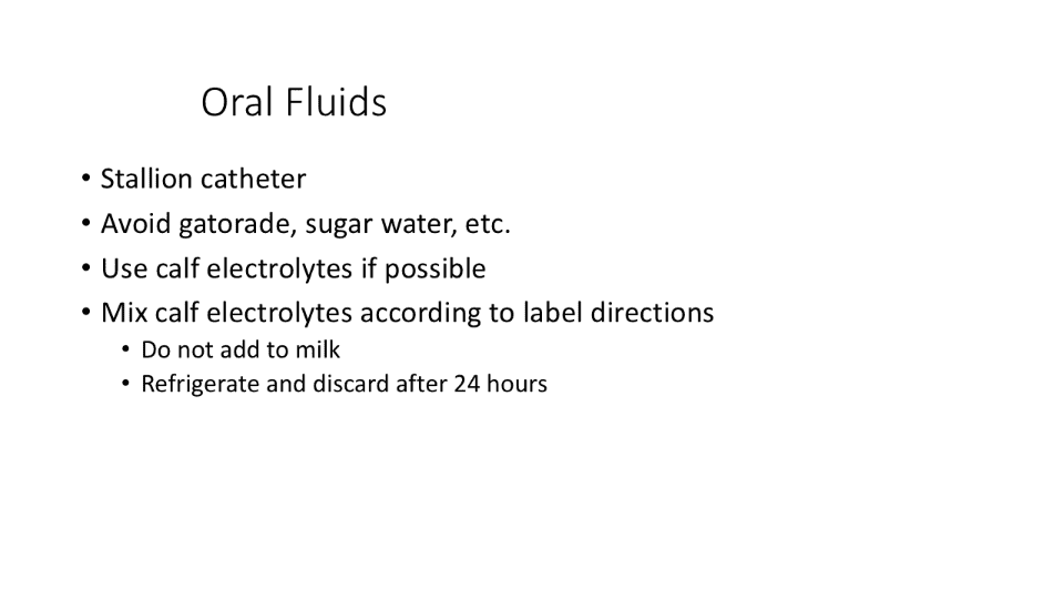 - Correct deficit with oral fluids unless rumen disease or GI obstruction