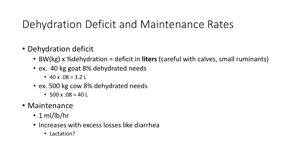 - BW(kg) x %dehydration = deficit in liters (careful with calves, small ruminants)