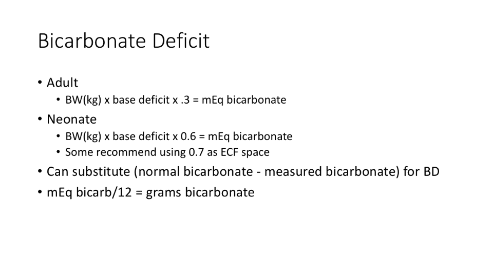- BW(kg) x base deficit x .3 = mEq bicarbonate
