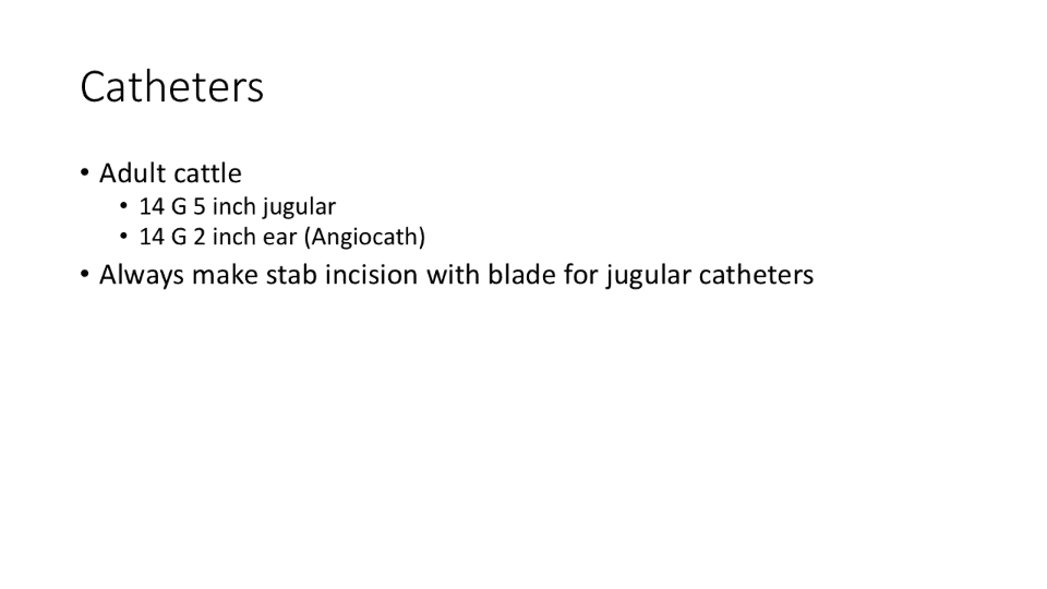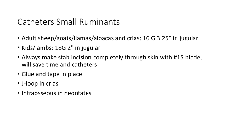 - Adult sheep/goats/llamas/alpacas and crias: 16 G 3.25 in jugular
