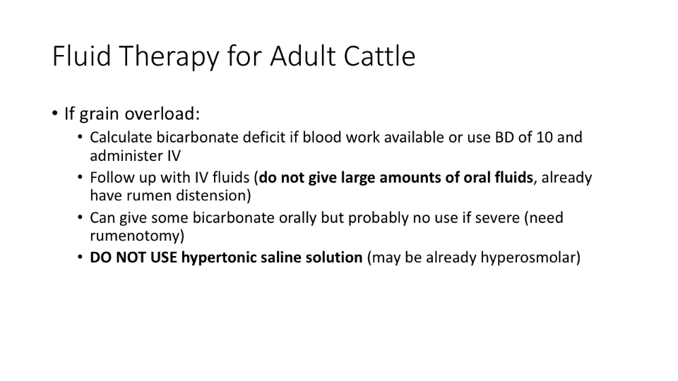 - Follow up with IV fluids (do not give large amounts of oral fluids, already have rumen distension)