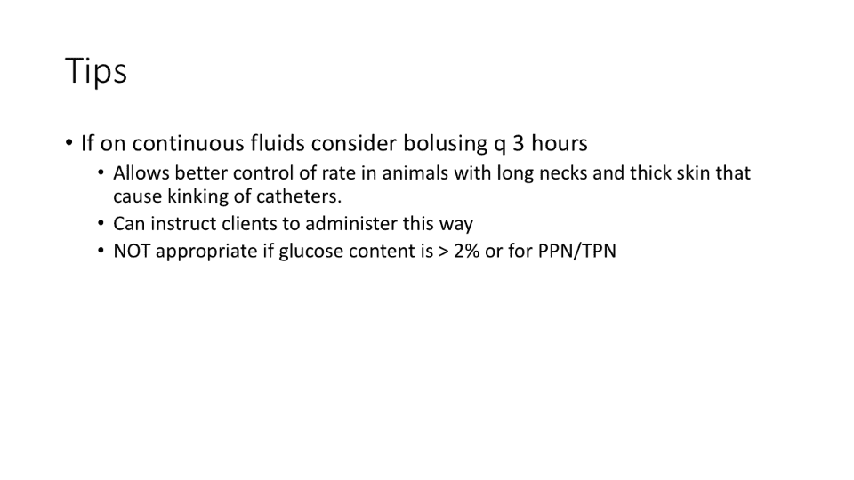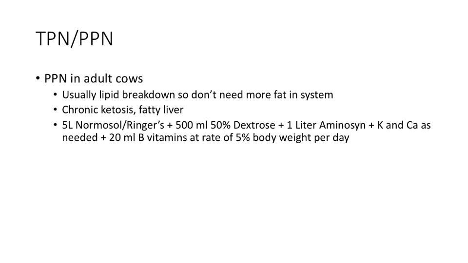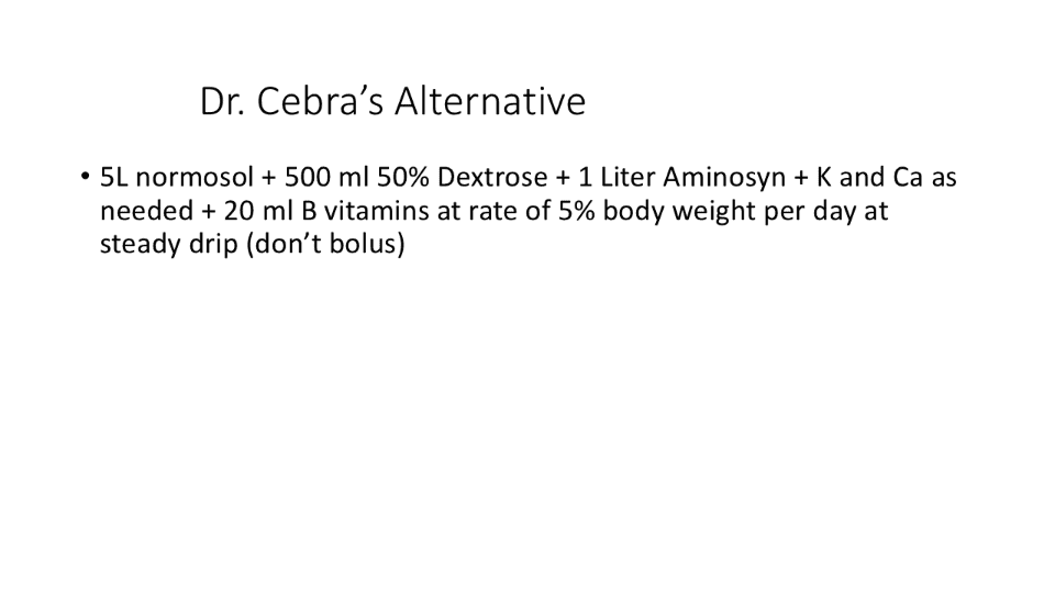 - 5L normosol + 500 ml 50% Dextrose + 1 Liter Aminosyn + K and Ca as needed + 20 ml B vitamins at rate of 5% body weight per day at steady drip (don’t bolus)p.28