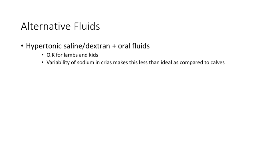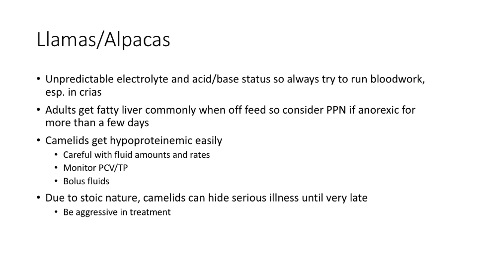 - Unpredictable electrolyte and acid/base status so always try to run bloodwork, esp. in crias