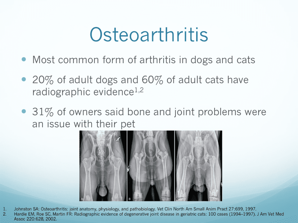 - 20% of adult dogs and 60% of adult cats have radiographic evidence1,2