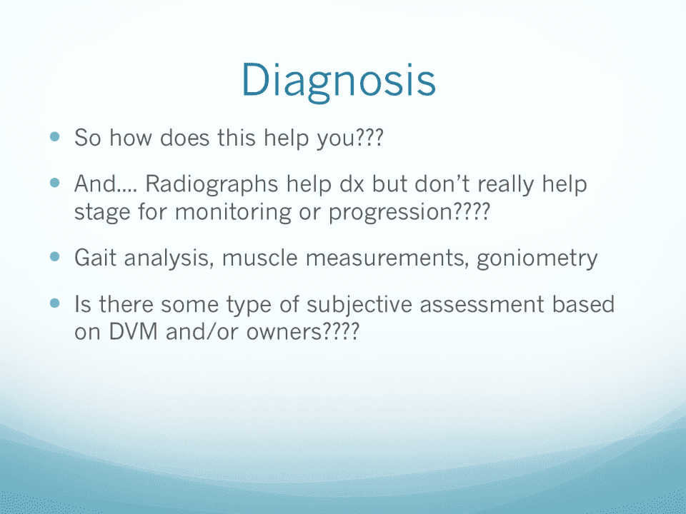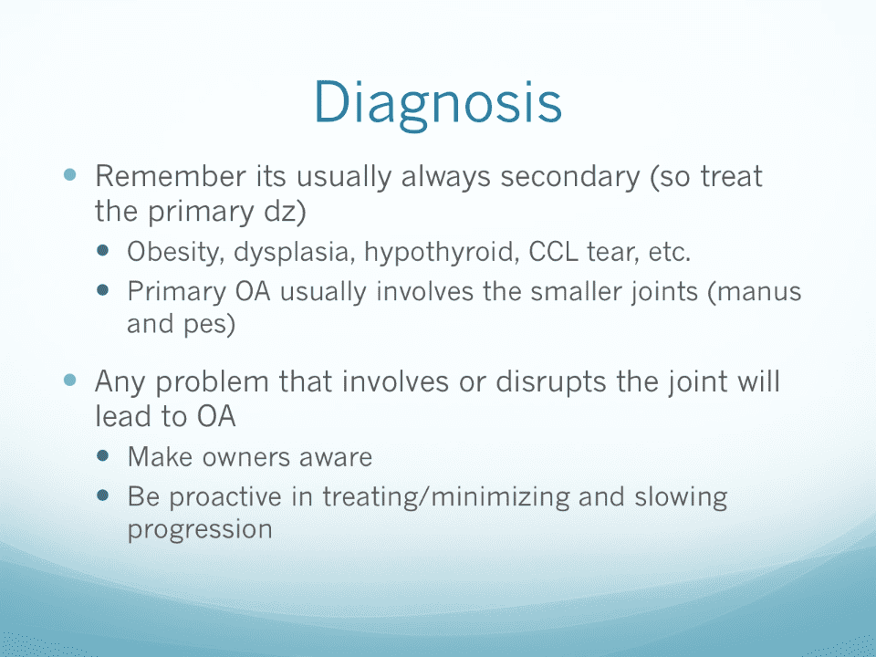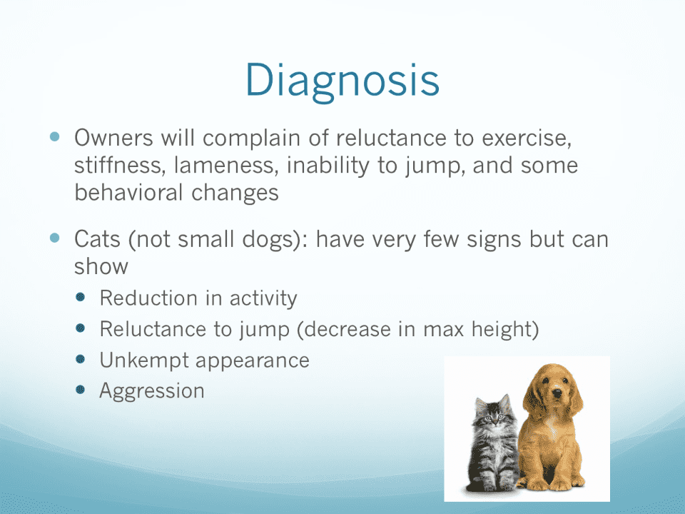 - Owners will complain of reluctance to exercise, stiffness, lameness, inability to jump, and some behavioral changes
