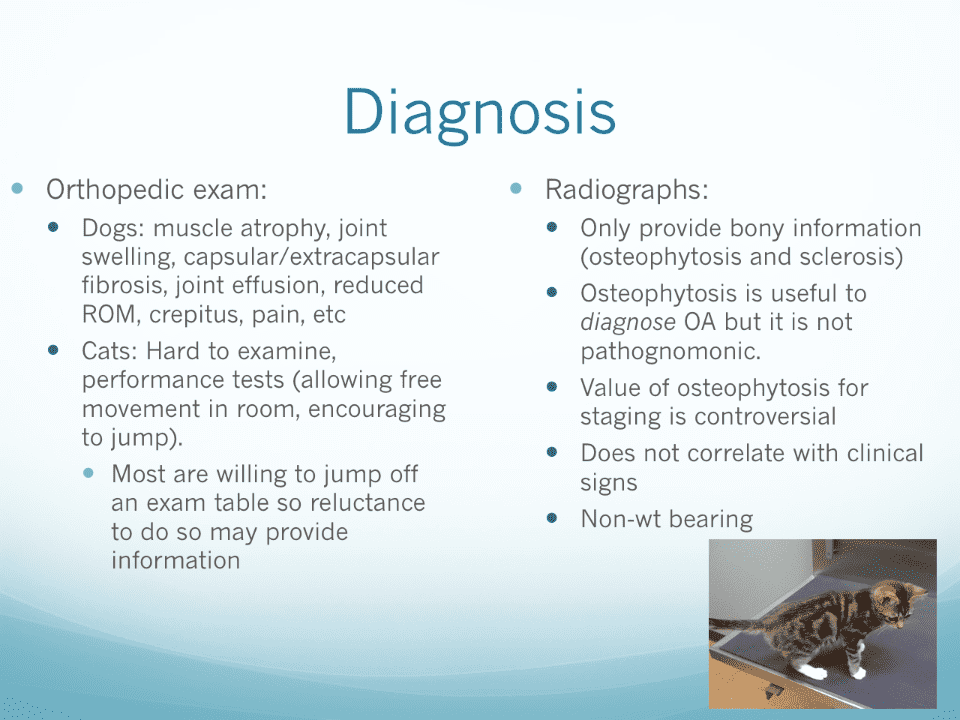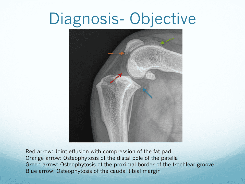 - Dogs: muscle atrophy, joint swelling, capsular/extracapsular fibrosis, joint effusion, reduced ROM, crepitus, pain, etc