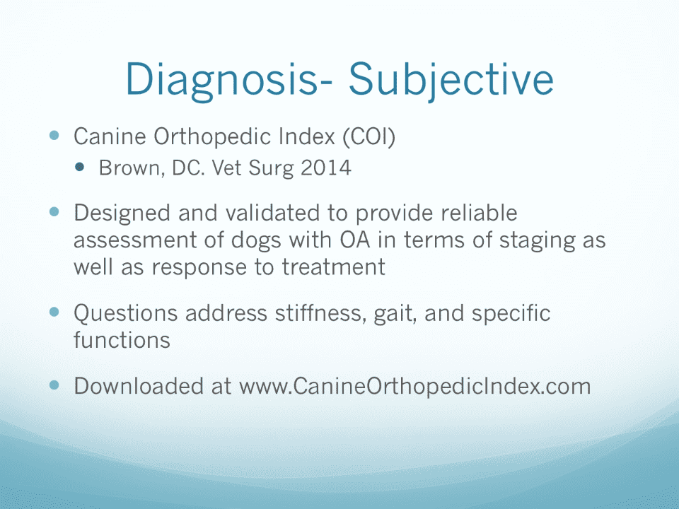 - Designed and validated to provide reliable assessment of dogs with OA in terms of staging as well as response to treatment