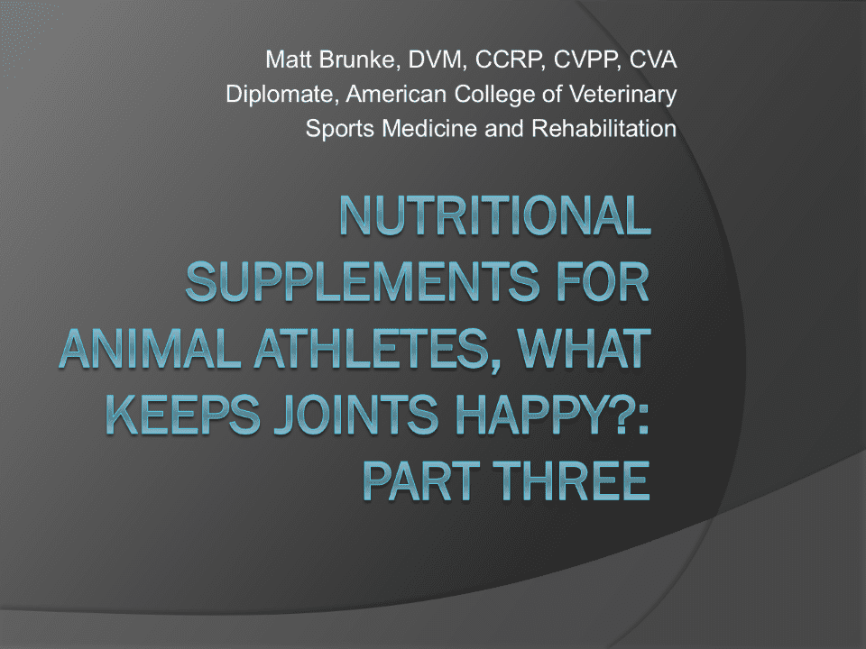 p.1 p.1 Matt Brunke, DVM, CCRP, CVPP, CVA Diplomate, American College of Veterinary Sports Medicine and Rehabilitation NUTRITIONAL SUPPLEMENTS FOR ANIMAL ATHLETES, WHAT KEEPS JOINT HAPPY?: