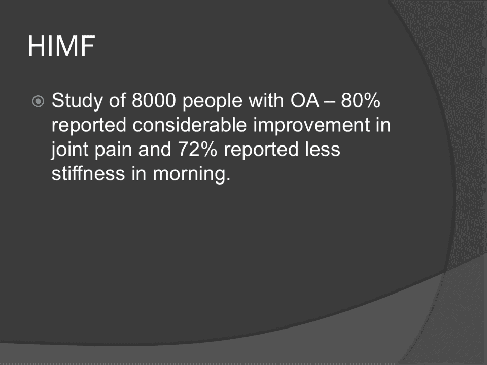 - Study of 8000 people with OA - 80% reported considerable improvement in joint pain and 72% reported less stiffness in morning.p.21