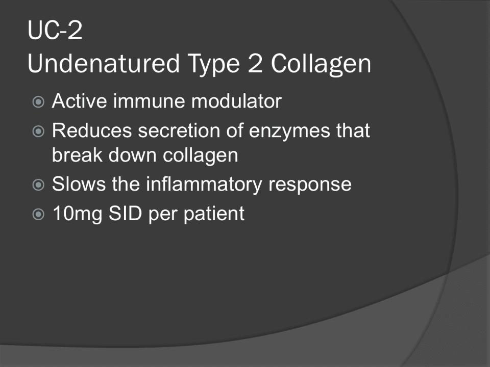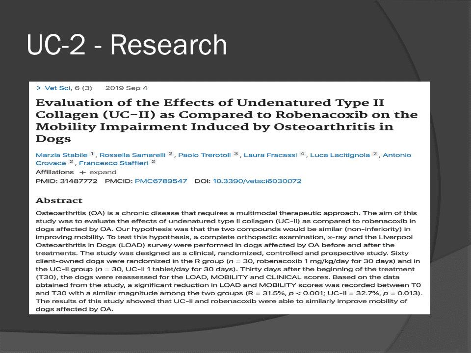 p.27 p.27 UC-2 - Research Evolution of the Effects of Undenatured Type-II Collagen (UC-II) as Compared to Robenacoxib on the Mobility Impairment Induced by Osteoarthritis in Dogs p.27