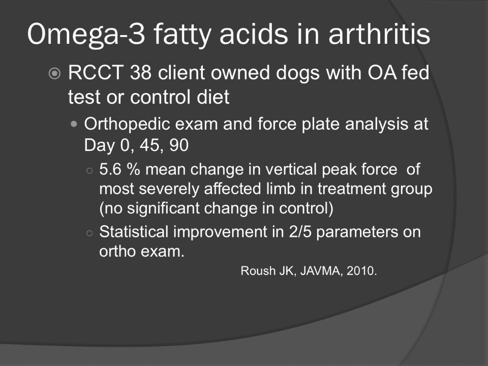 - Statistical improvement in 2/5 parameters on ortho exam.Roush JK, JAVMA, 2010. p.19