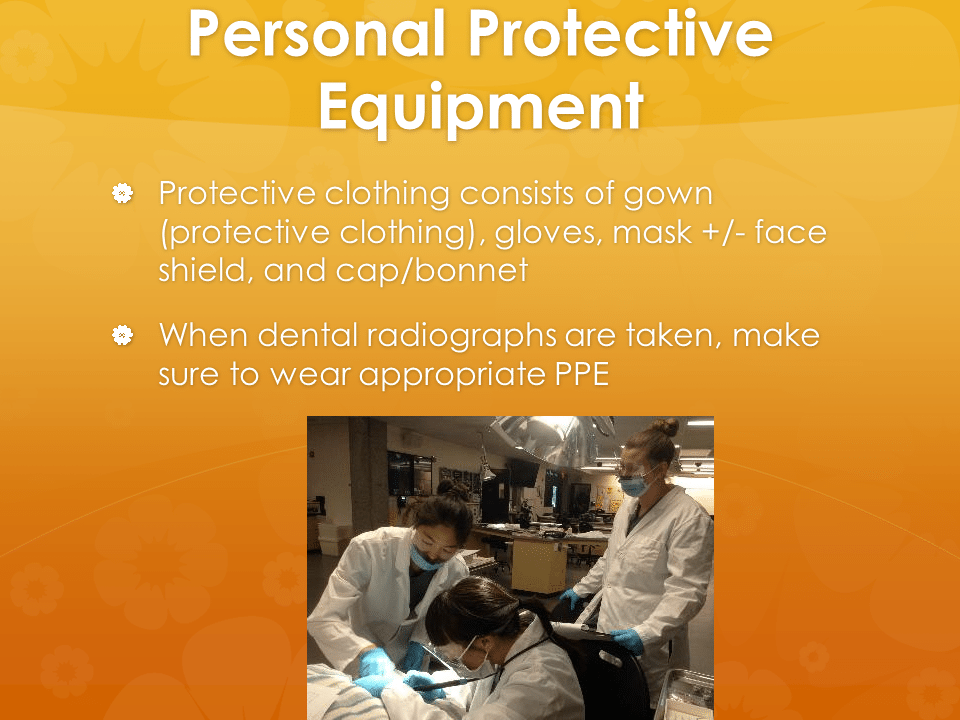 - When dental radiographs are taken, make sure to wear appropriate PPEp.8 -