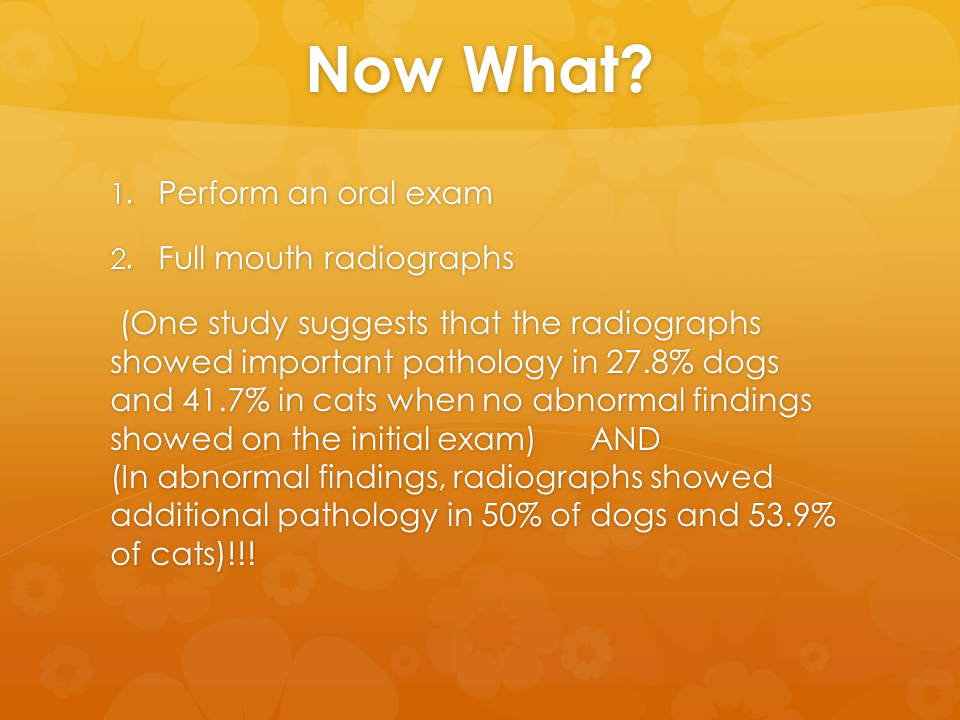 (One study suggests that the radiographs showed important pathology in 27.8% dogs and 41.7% in cats when no abnormal findings showed on the initial exam) AND