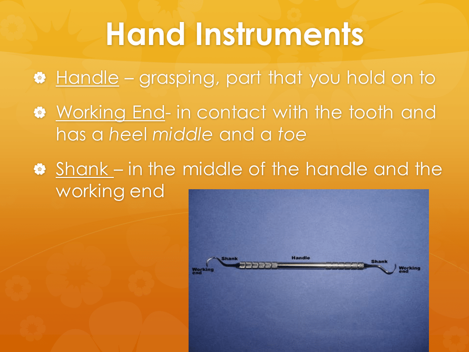 - Working End- in contact with the tooth and has a heel middle and a toe