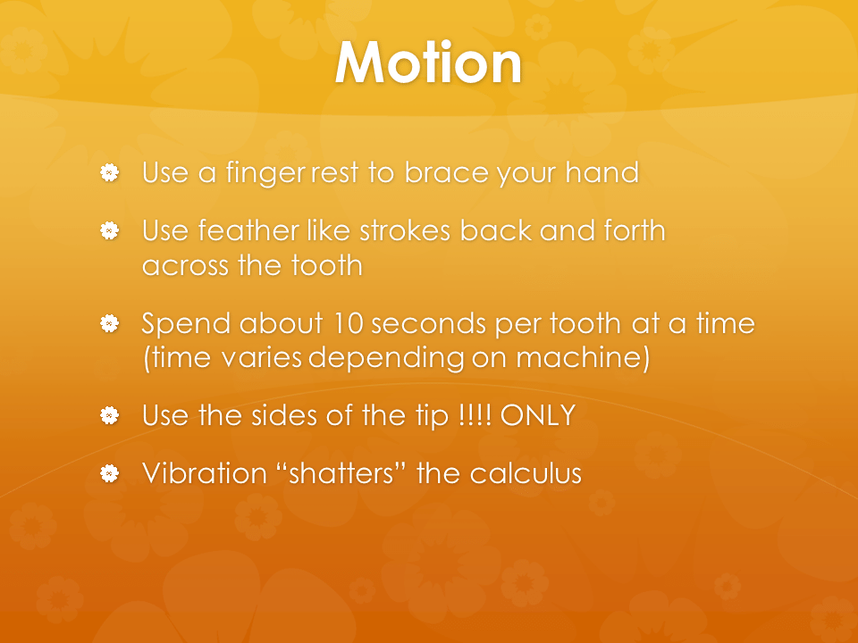 - Sonic – tip vibrates in an elliptical motion Up to 18,000 cycles per second