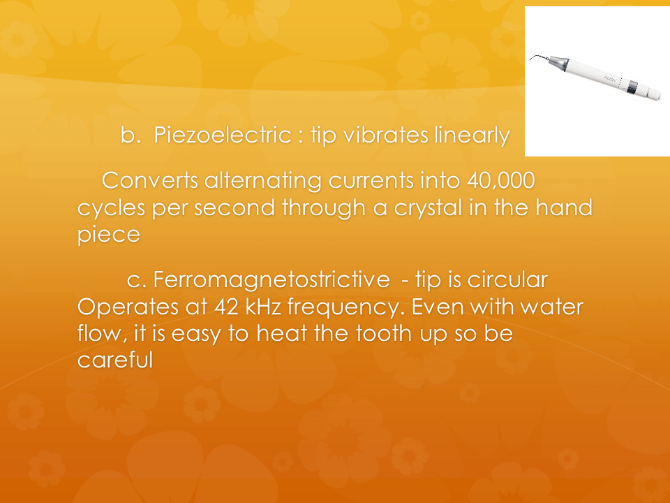Converts alternating currents into 40,000 cycles per second through a crystal in the hand piecec. Ferromagnetostrictive - tip is circular