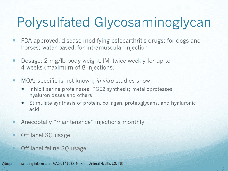 - Off label feline SQ usageAdequan prescribing information. NADA 141038, Novartis Animal Health, US, INC