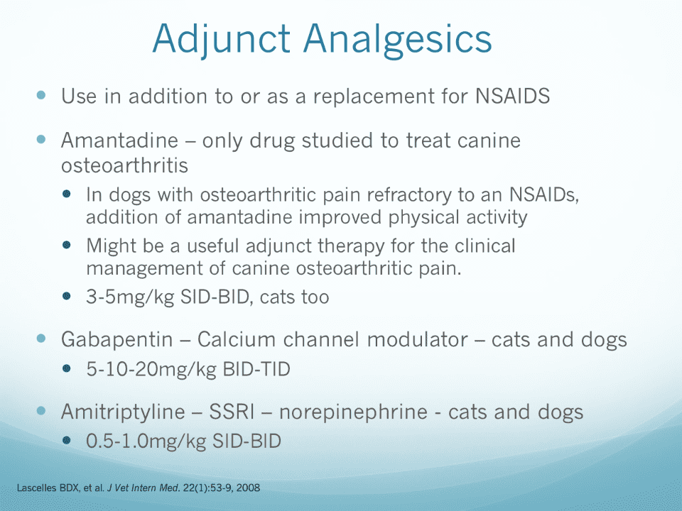 - In dogs with osteoarthritic pain refractory to an NSAIDs, addition of amantadine improved physical activity