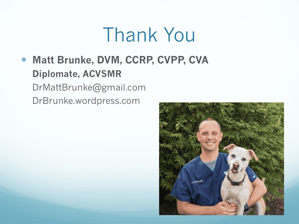 - Matt Brunke, DVM, CCRP, CVPP, CVA Diplomate, ACVSMR