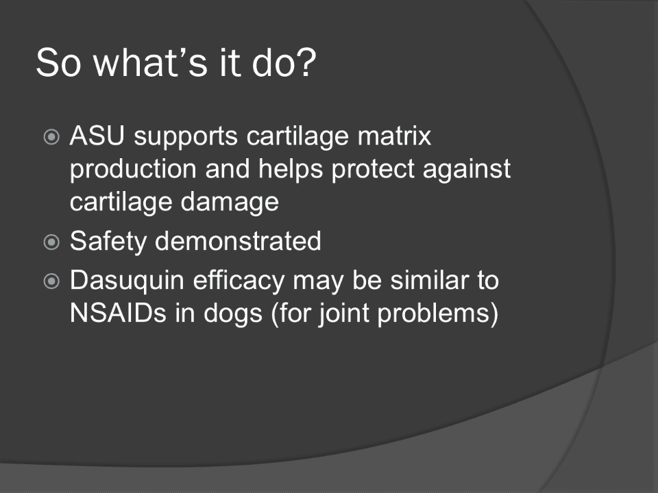 - Dasuquin efficacy may be similar to NSAIDs in dogs (for joint problems)p.3 -