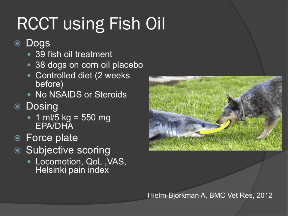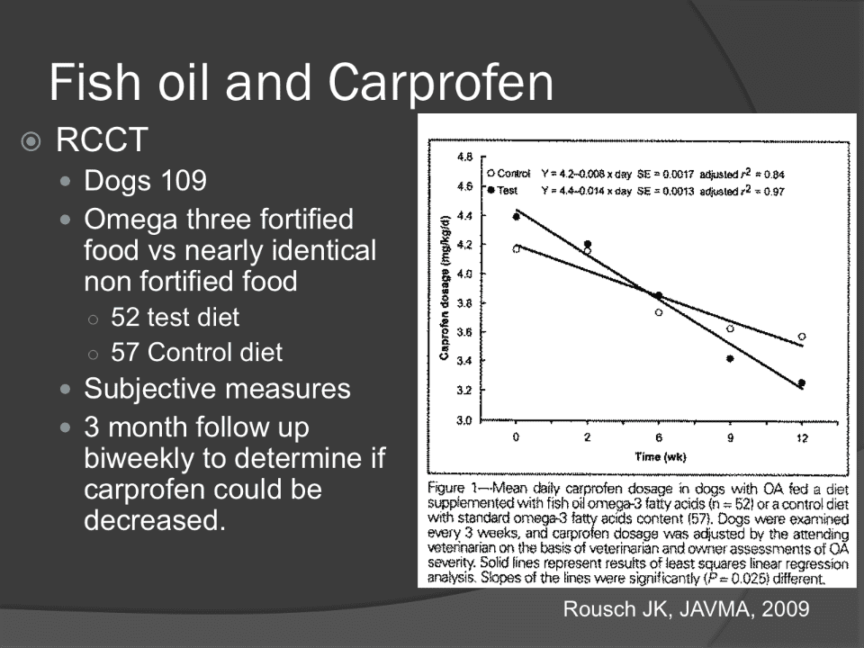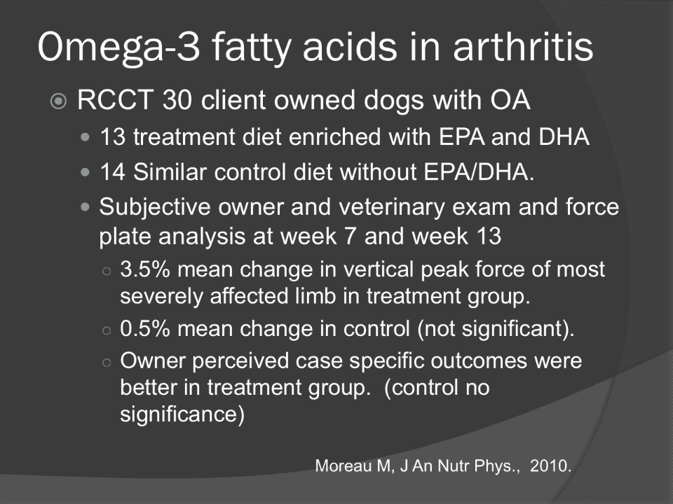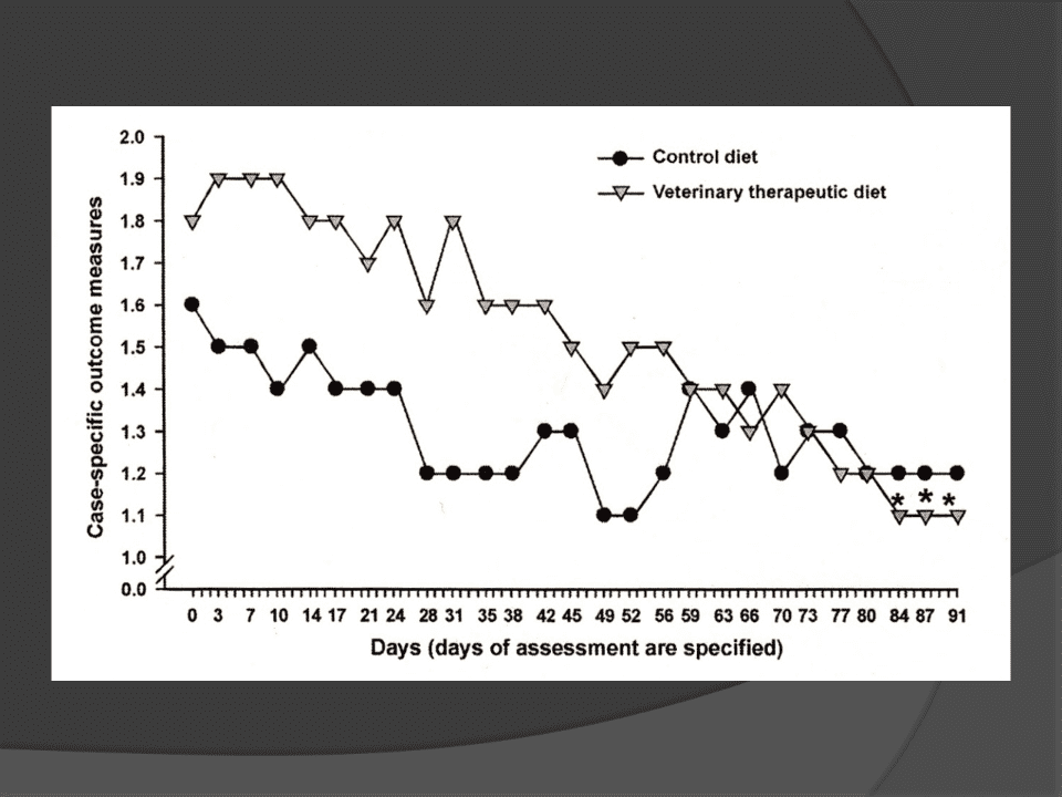 - Owner perceived case specific outcomes were better in treatment group. (control no significance)Moreau M, J An Nutr Phys., 2010.