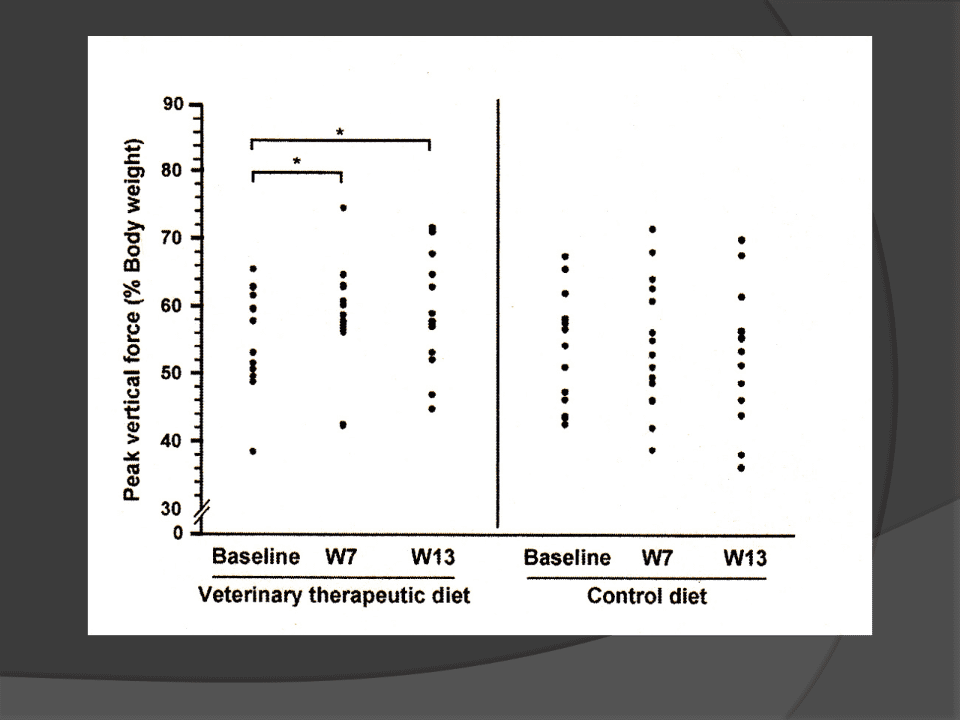 - Subjective owner and veterinary exam and force plate analysis at week 7 and week 13