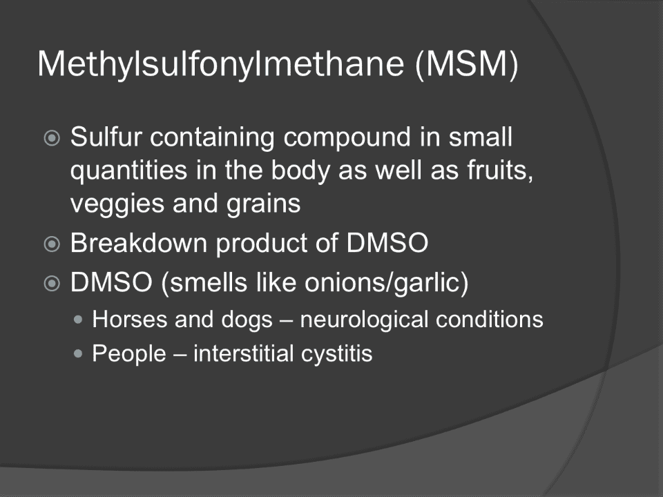 - Sulfur containing compound in small quantities in the body as well as fruits, veggies and grains - Breakdown product of DMSO