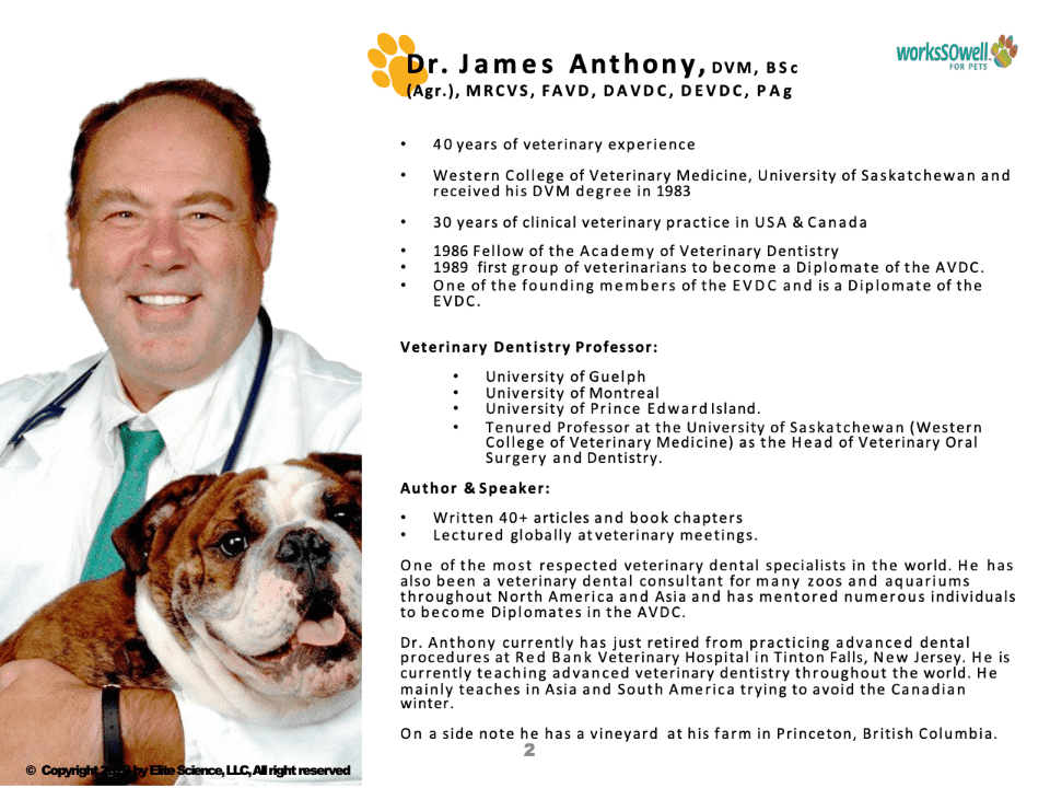 Dr. Anthony has just retired from practicing advanced dental procedures at Red Bank Veterinary Hospital in Tinton Falls, New Jersey. He is currently teaching advanced veterinary dentistry throughout the world. He mainly teaches in Asia and South America trying to avoid the Canadian winter.