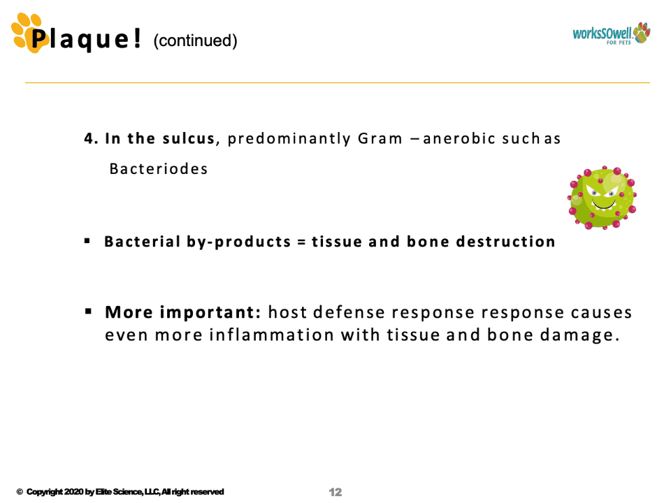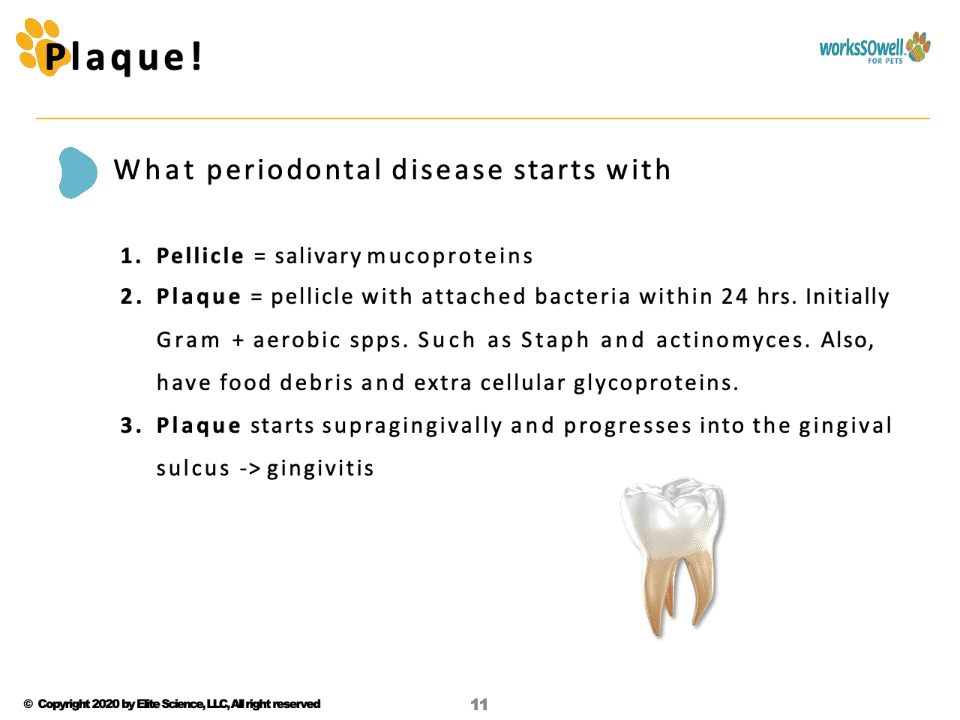 2. Plaque = pellicle with attached bacteria within 24 hrs. Initially Gram + aerobic spps. Such as Staph and actinomyces. Also, have food debris and extracellular glycoproteins.