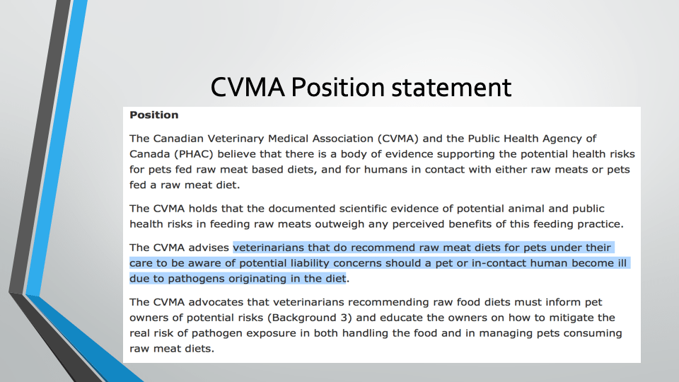 The CVMA advocates that veterinarians recommending raw food diets must inform pet owners of potential risks (Background 3) and educate the owners on how to mitigate the real risk of pathogen exposure in both handling the food and in managing pets consuming raw meat diets.p.9 -