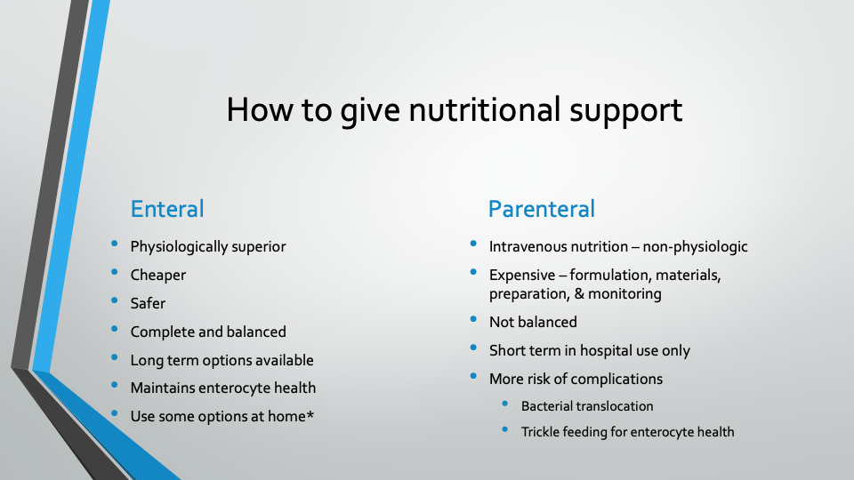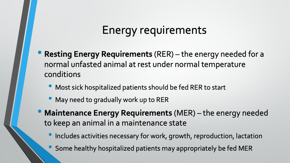 - Prevent malnutrition (generally accepted rule) – determine RER on hospital admission and establish nutritional support within 24 hours if voluntary intake is inadequate