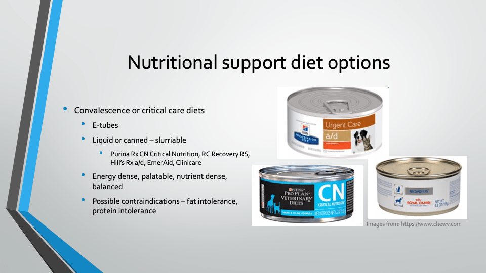 - Purina Rx CN Critical Nutrition, RC Recovery RS, Hill’s Rx a/d, EmerAid, Clinicare