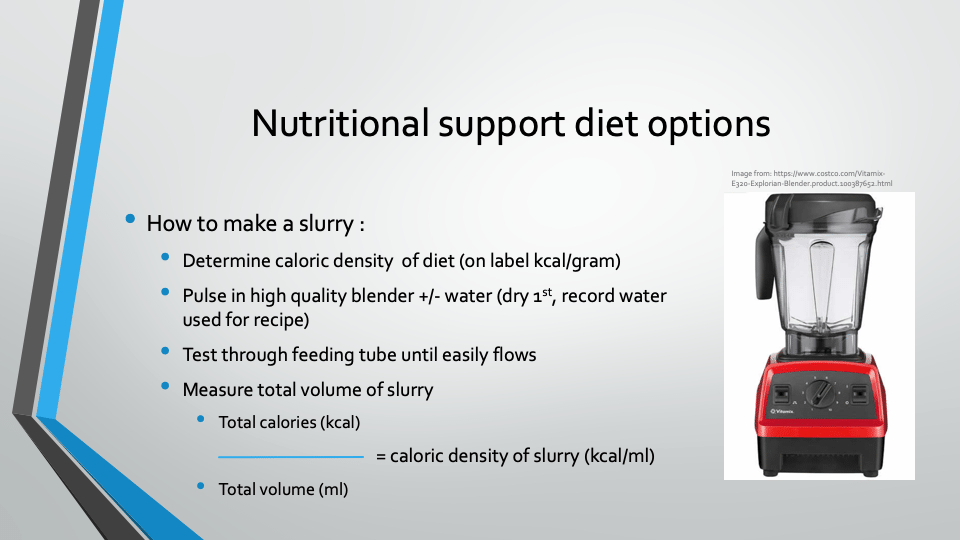 - Blenderized commercial diet = Slurry
