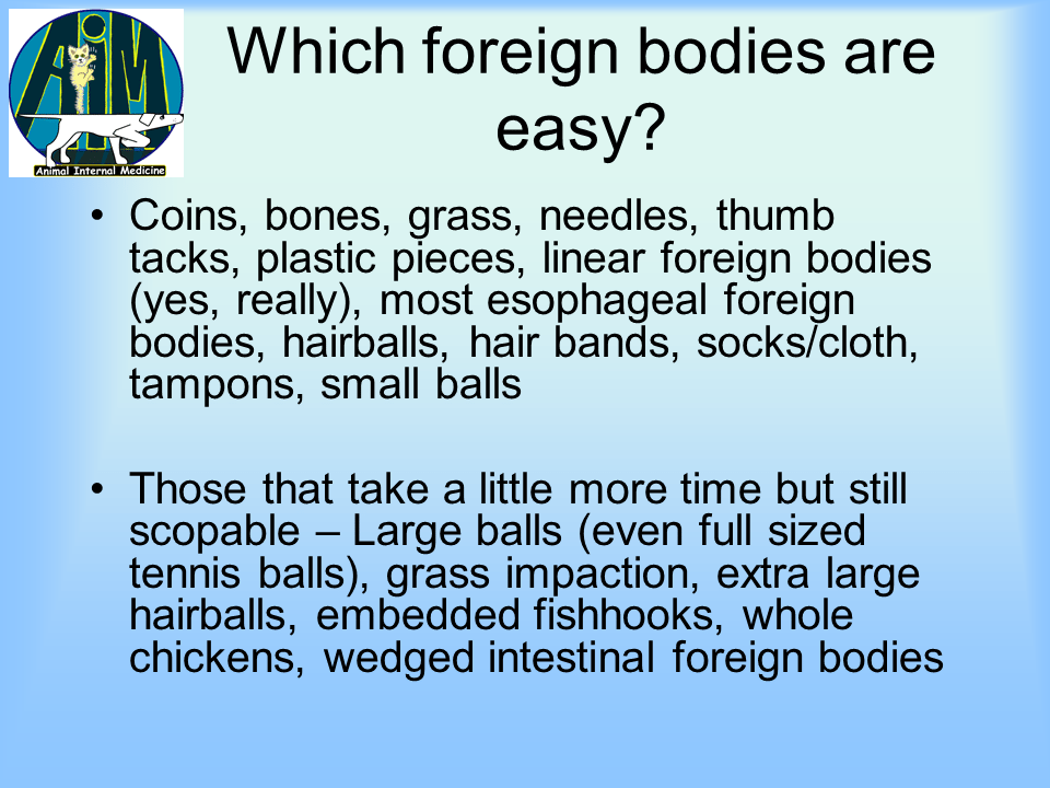 - While some foreign bodies will move on and save the owner the expense of endoscopy, I never like to sleep on a gastric foreign body because they might become an intestinal foreign body and can cause a surprising amount of damage in a short time.