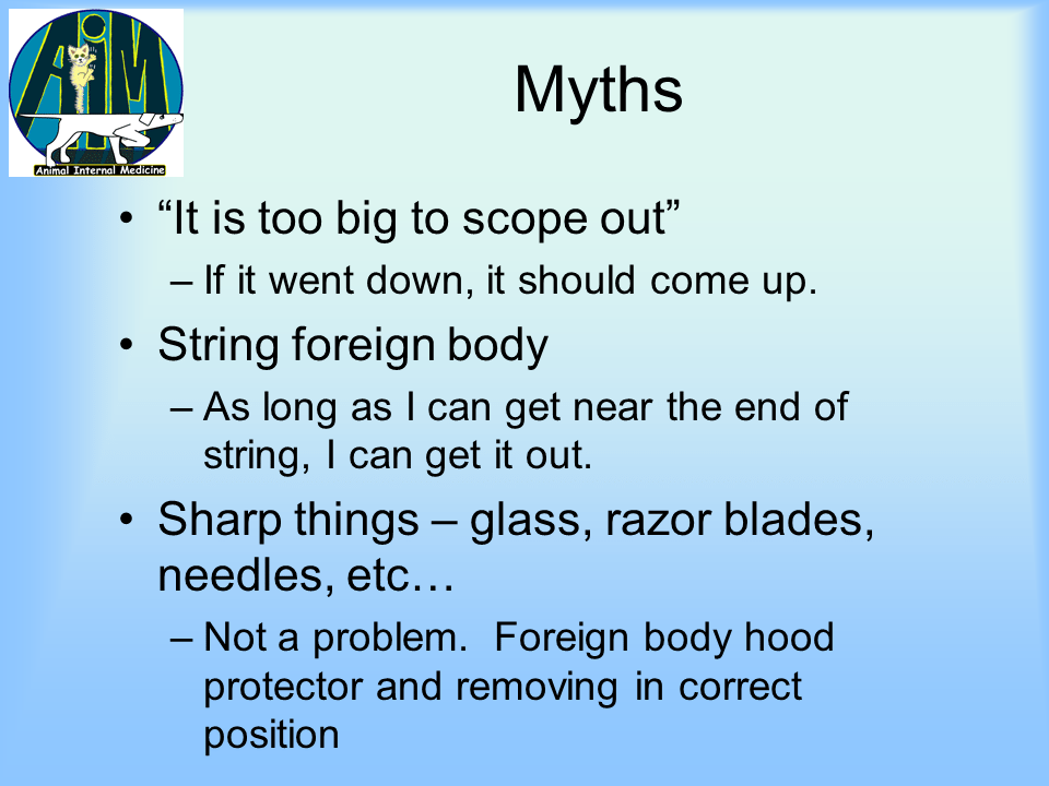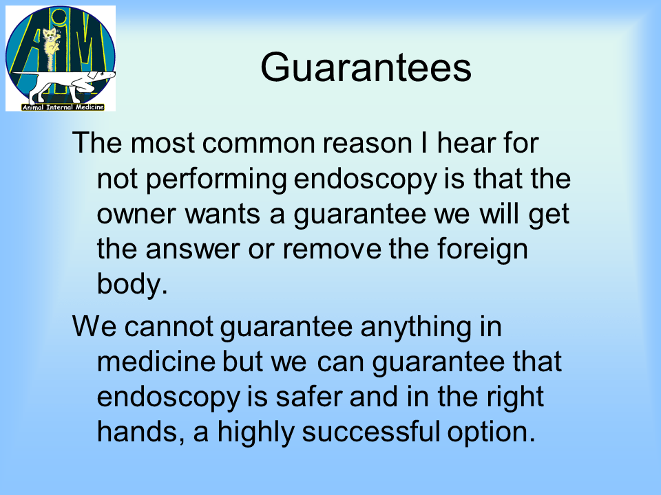 The most common reason I hear for not performing endoscopy is that the owner wants a guarantee we will get the answer or remove the foreign body.We cannot guarantee anything in medicine but we can guarantee that endoscopy is safer and in the right hands, a highly successful option.