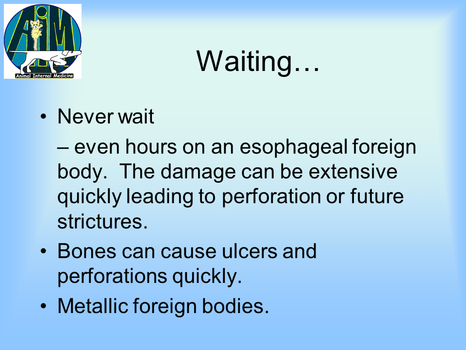 - Never wait – even hours on an esophageal foreign body. The damage can be extensive quickly leading to perforation or future strictures.