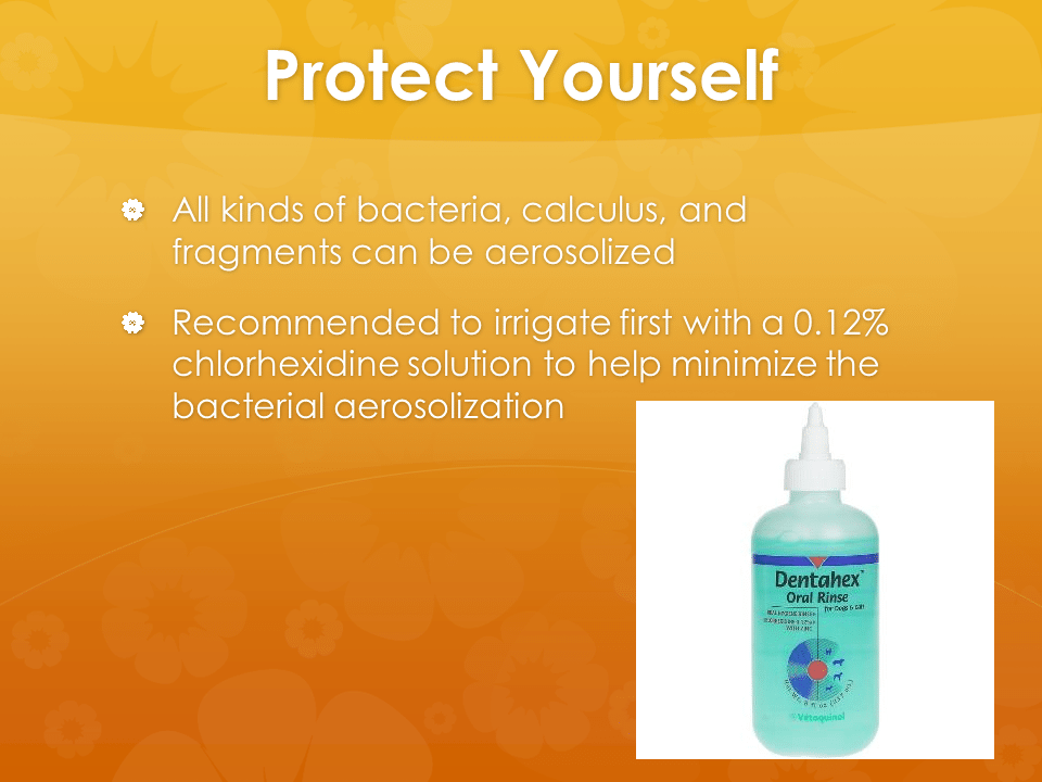 -Recommended to irrigate first with a 0.12% chlorhexidine solution to help minimize the bacterial aerosolizationp.7 -