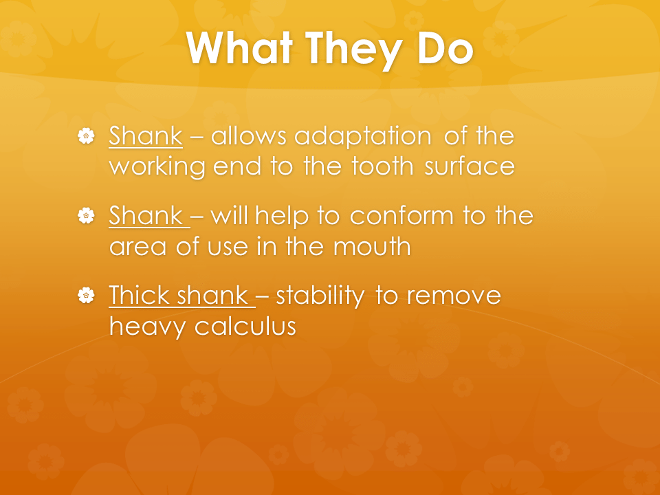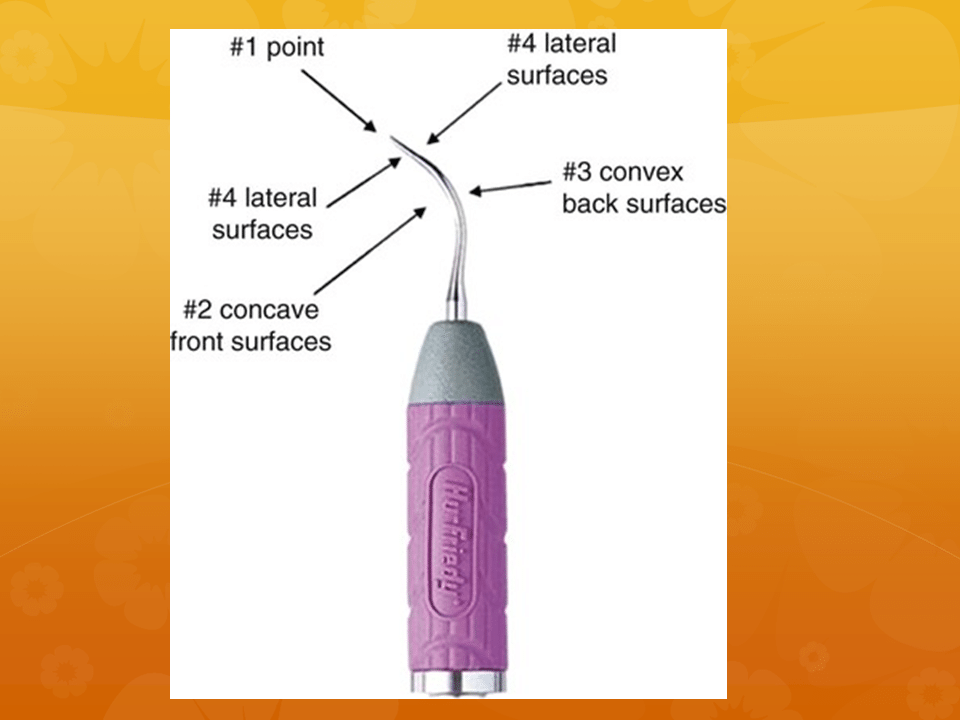 - Working End- in contact with the tooth and has a heel middle and a toe