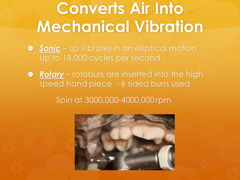 - Sonic – tip vibrates in an elliptical motion Up to 18,000 cycles per second