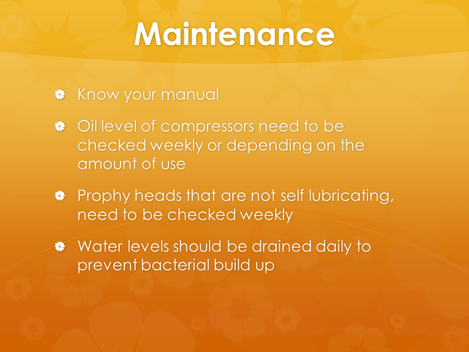 - Prophy heads that are not self lubricating, need to be checked weekly
